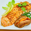 Pan-Seared Salmon with choice of Chef Isra’s Caribbean- inspired green herb sauce or curry sauce. Served with baked yams and seasonal green salad.